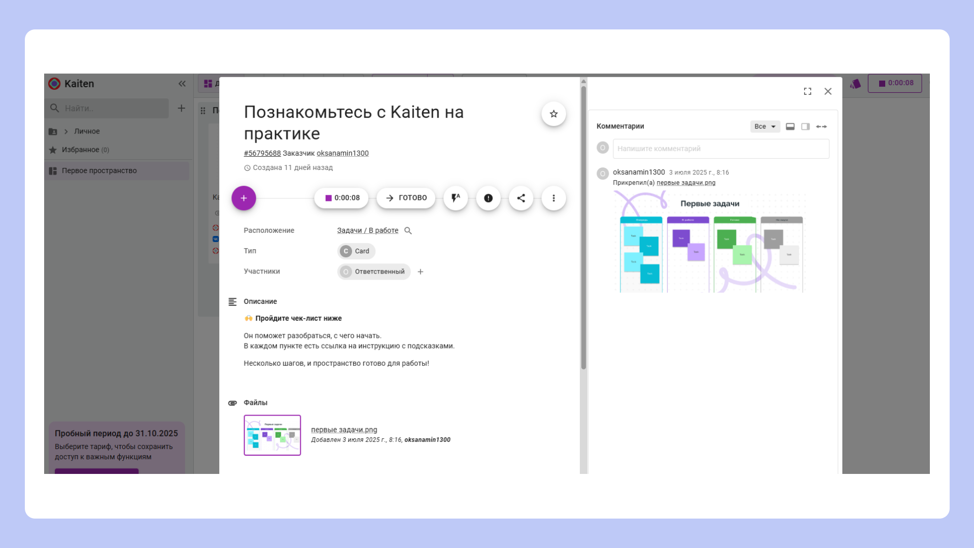 - Создайте свое поле (текст/список/число) в карточке задачи и заполните его — проверьте, можно ли фильтровать и строить отчеты по этому полю.