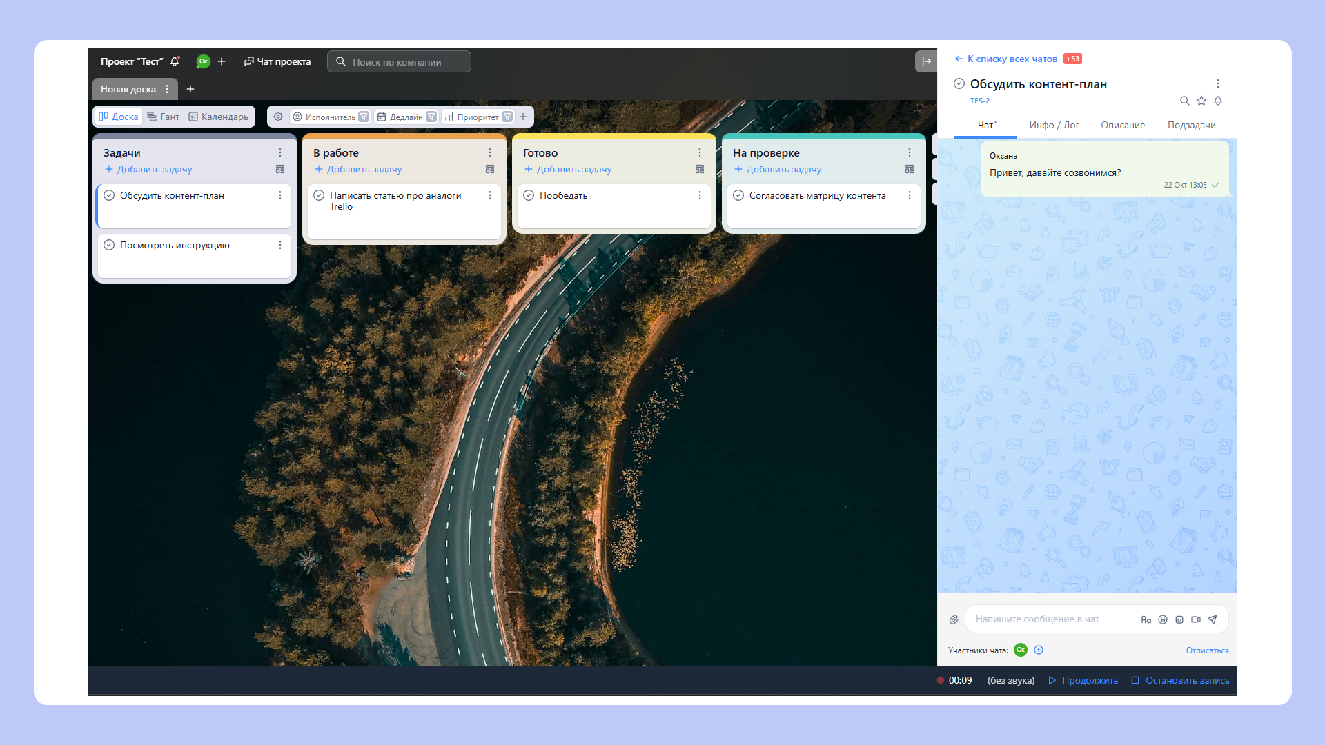 Ключевые преимущества: низкий порог входа позволяет новым сотрудникам начать работу буквально за несколько минут. При этом интерфейс не упрощен до примитивизма и содержит все необходимое для управления разработкой. Также наличие голосовых и видеозвонков прямо внутри карточек задач и чатов сокращает необходимость использовать сторонние мессенджеры.