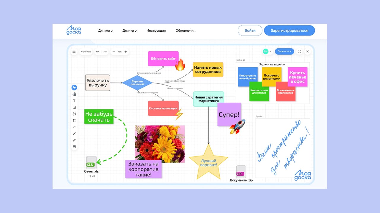 Онлайн-доски — это визуализация мыслей. В отличие от текстовых документов или таблиц, здесь нет жёсткой структуры. Вы получаете бесконечное полотно, на котором можно клеить стикеры, рисовать стрелки, строить сложные схемы.
