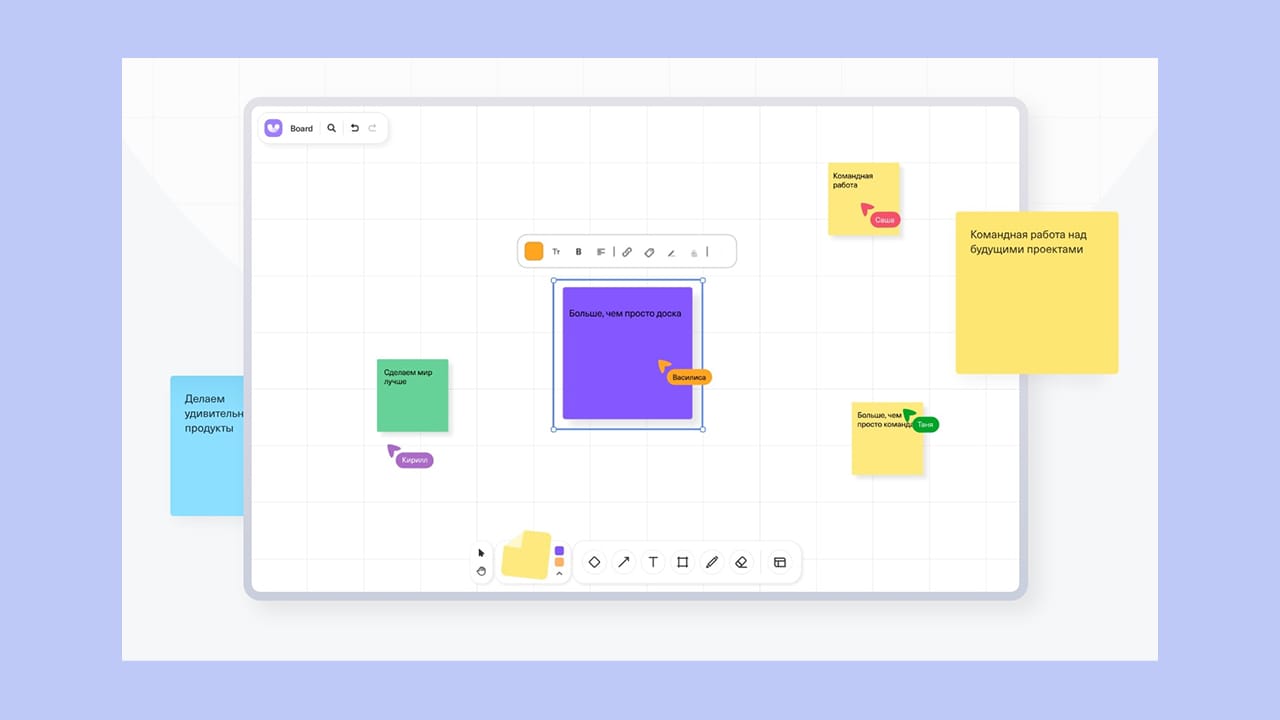 Карточки, стикеры, визуальные элементы на общем пространстве. Поддерживает видеозвонки внутри платформы.