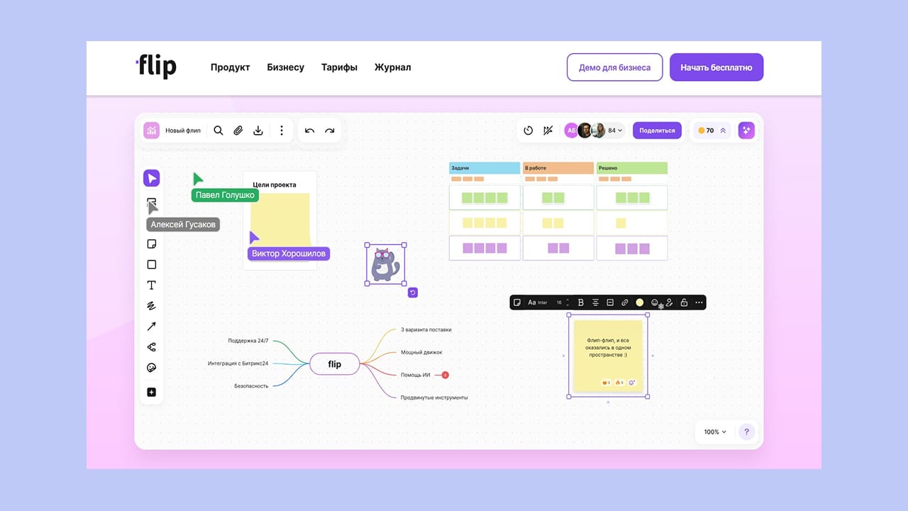 - Мини — бесплатно, до 15 участников, 3 флипа, 5 AI-токенов в месяц.