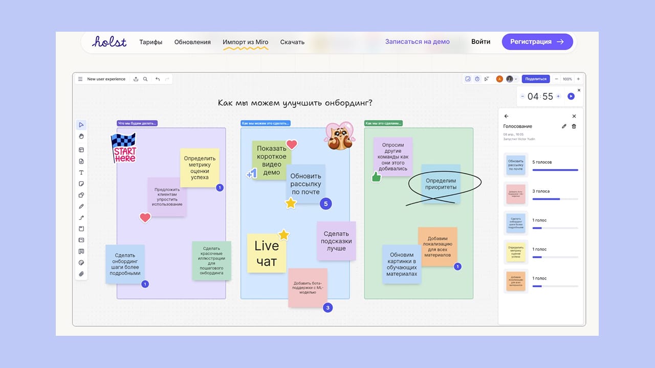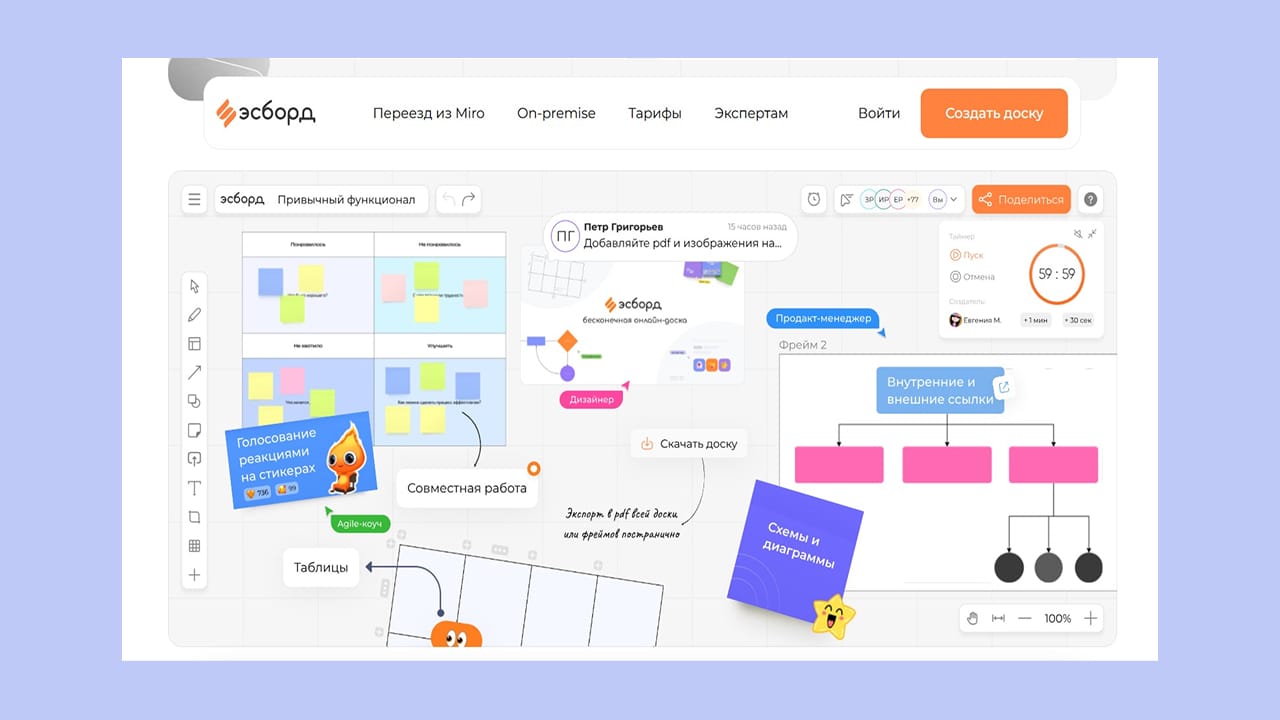 Все необходимые инструменты для фасилитации: голосование, таймер, экспорт в PDF.
