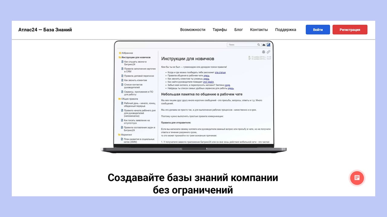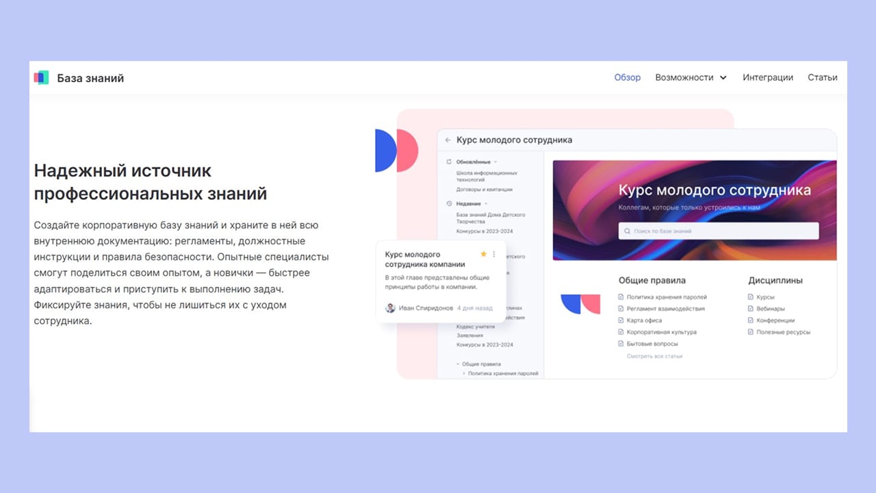 Создана для экосистемы «Битрикс24», но может работать автономно. Делает упор на обучение и быструю адаптацию сотрудников. Позволяет хранить все документы в одной системе, назначать права доступа и восстанавливать данные из резервной копии. Есть интеграции с amoCRM и Admin24. Это удобно для компаний, где знания тесно связаны с клиентскими процессами.