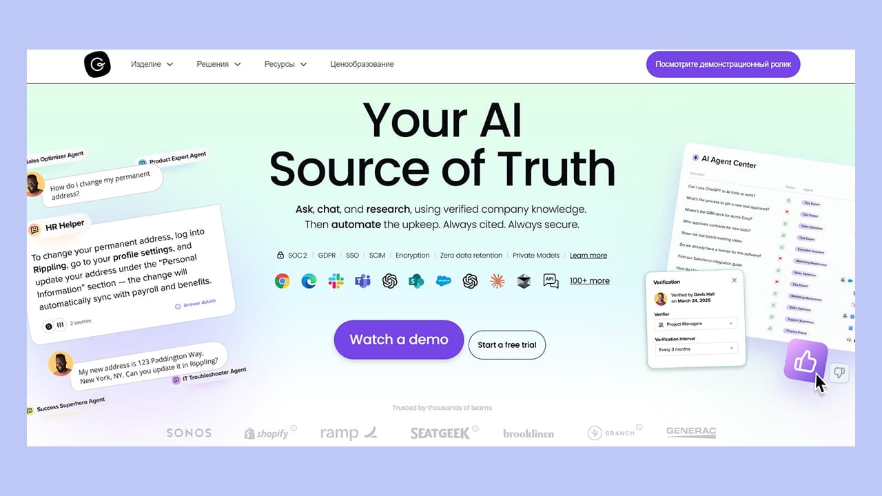Сервис, который использует искусственный интеллект для управления знаниями. Guru интегрируется с Slack, Google Drive, GitHub и другими платформами, обучается на пользовательских запросах и выдает актуальные ответы в момент работы. Подходит компаниям, которые хотят «живую» базу знаний, а не просто статичную вики.