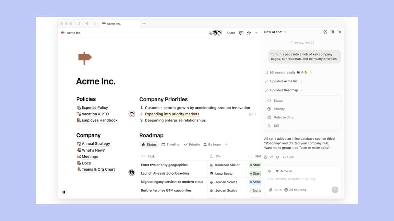 Документы поддерживают таблицы, изображения, видео, календари, ментальные карты и другие интерактивные элементы. Можно редактировать их вместе с коллегами в реальном времени и оставлять комментарии.