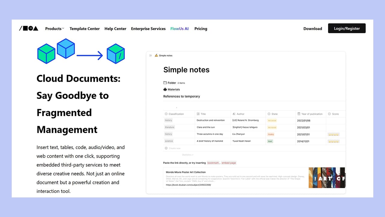 В документах можно комбинировать текст, таблицы, код, аудио, видео и веб-контент, а также встраивать материалы из сторонних сервисов. FlowUs работает как редактор, база знаний и инструмент визуального управления одновременно.