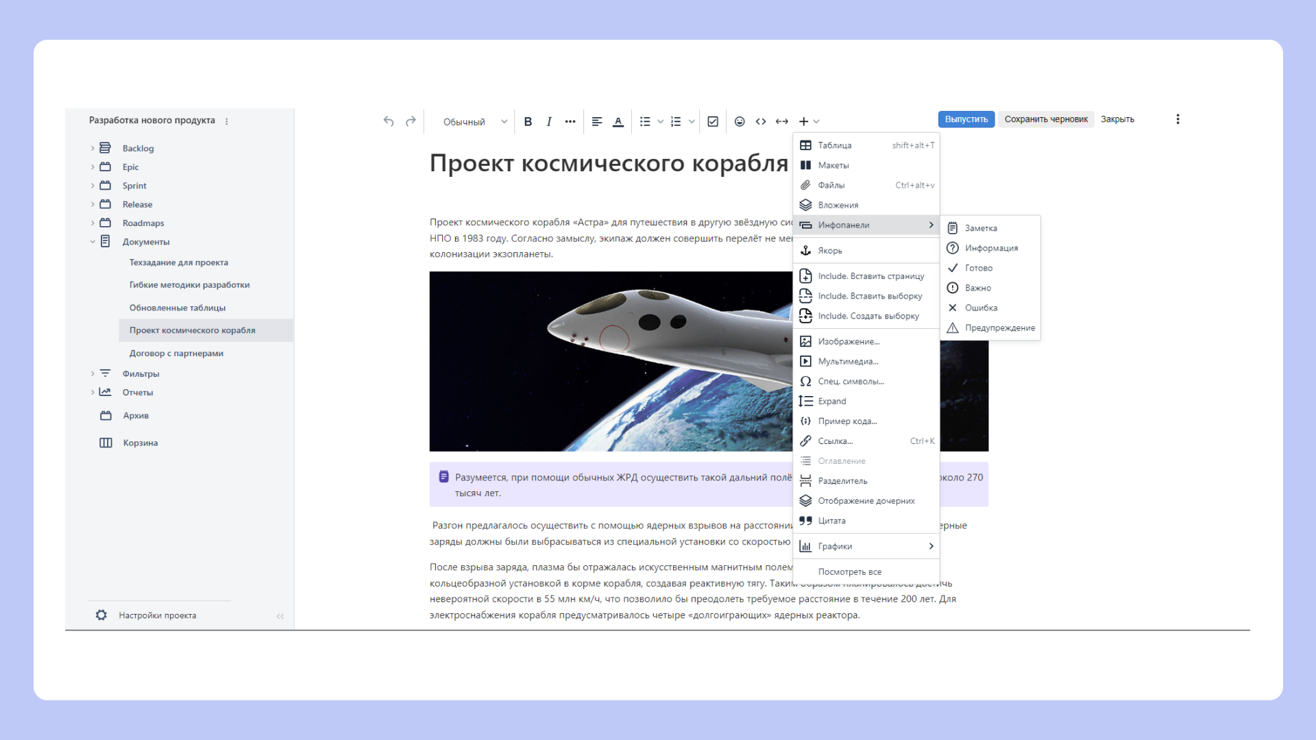 Платформа охватывает все ключевые процессы: управление проектами, учёт трудозатрат, планирование загрузки сотрудников и контроль бюджета. Для хранения и систематизации знаний здесь можно использовать встроенные текстовые поля с редактором. Он поддерживает формат Markdown, с помощью которого можно оформлять текст с заголовками, списками, ссылками и кодом. Это удобно для технических специалистов и аналитиков. Любой документ можно экспортировать или распечатать.