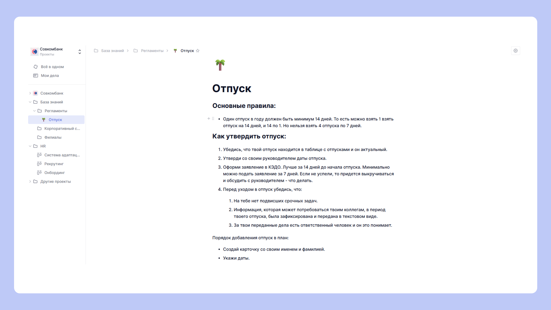 - Справочники по политике компании — информация о корпоративных бенефитах, отпускных процедурах, политике безопасности.