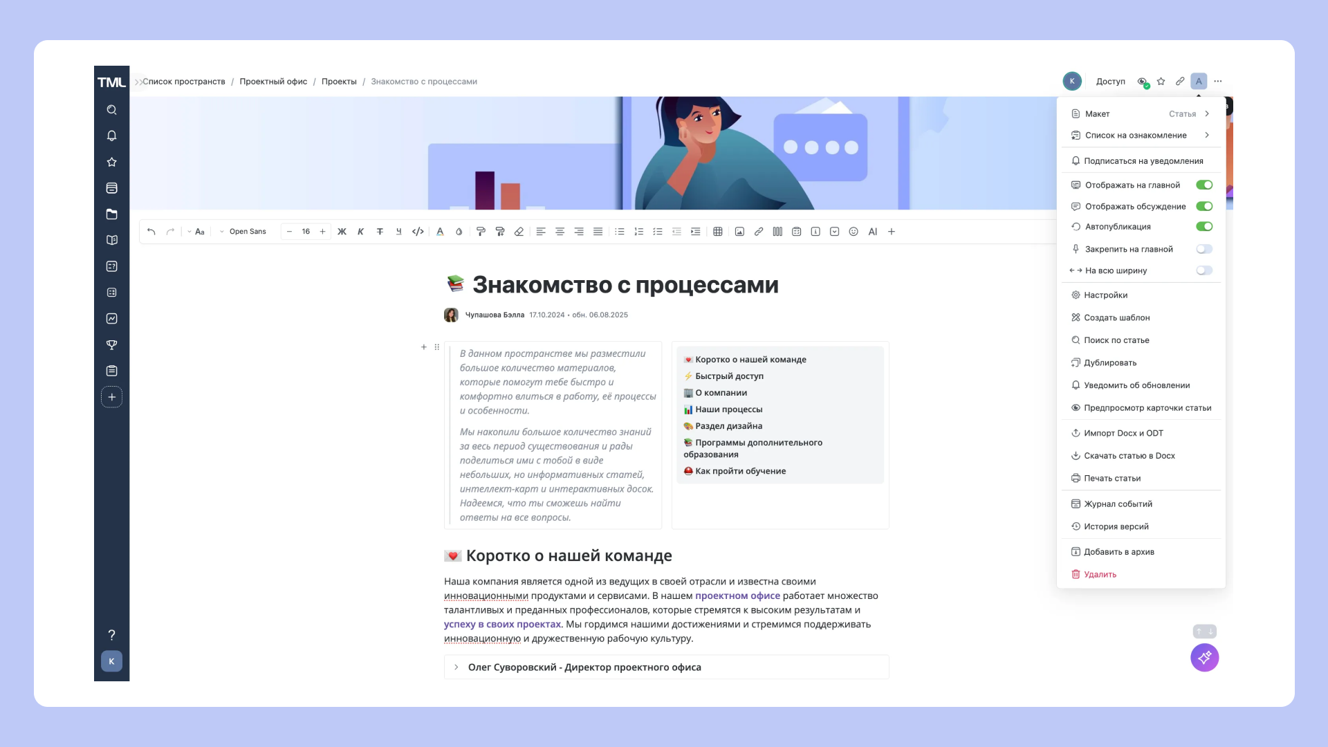 - Onboarding-материалы — пошаговые руководства для новых сотрудников: как настроить рабочее место, какие системы использовать, к кому обращаться за помощью.