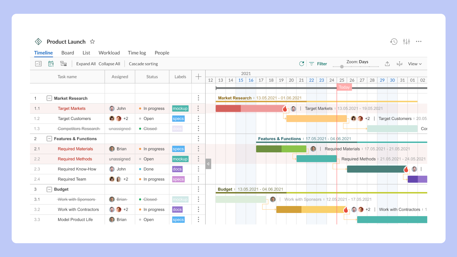 Ключевое преимущество: идеальна для тех, кому нужно скоординировать несколько отделов. Например, при запуске нового продукта: маркетинг, производство и логистика видят свои сроки на одном временном плане.