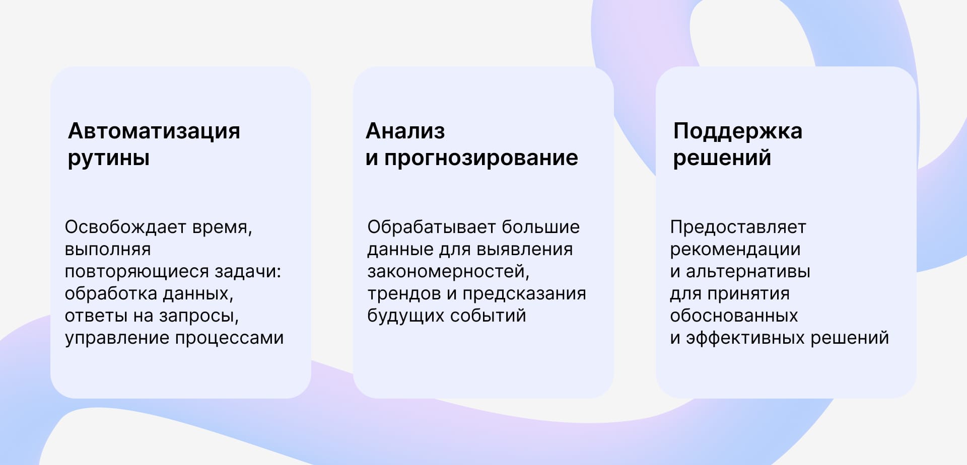 Поддержка принятия решений. ИИ не заменяет менеджера, но предоставляет ему данные для принятия решений. Например, показывает, что текущая загрузка команды критическая и новую задачу лучше отложить на неделю.