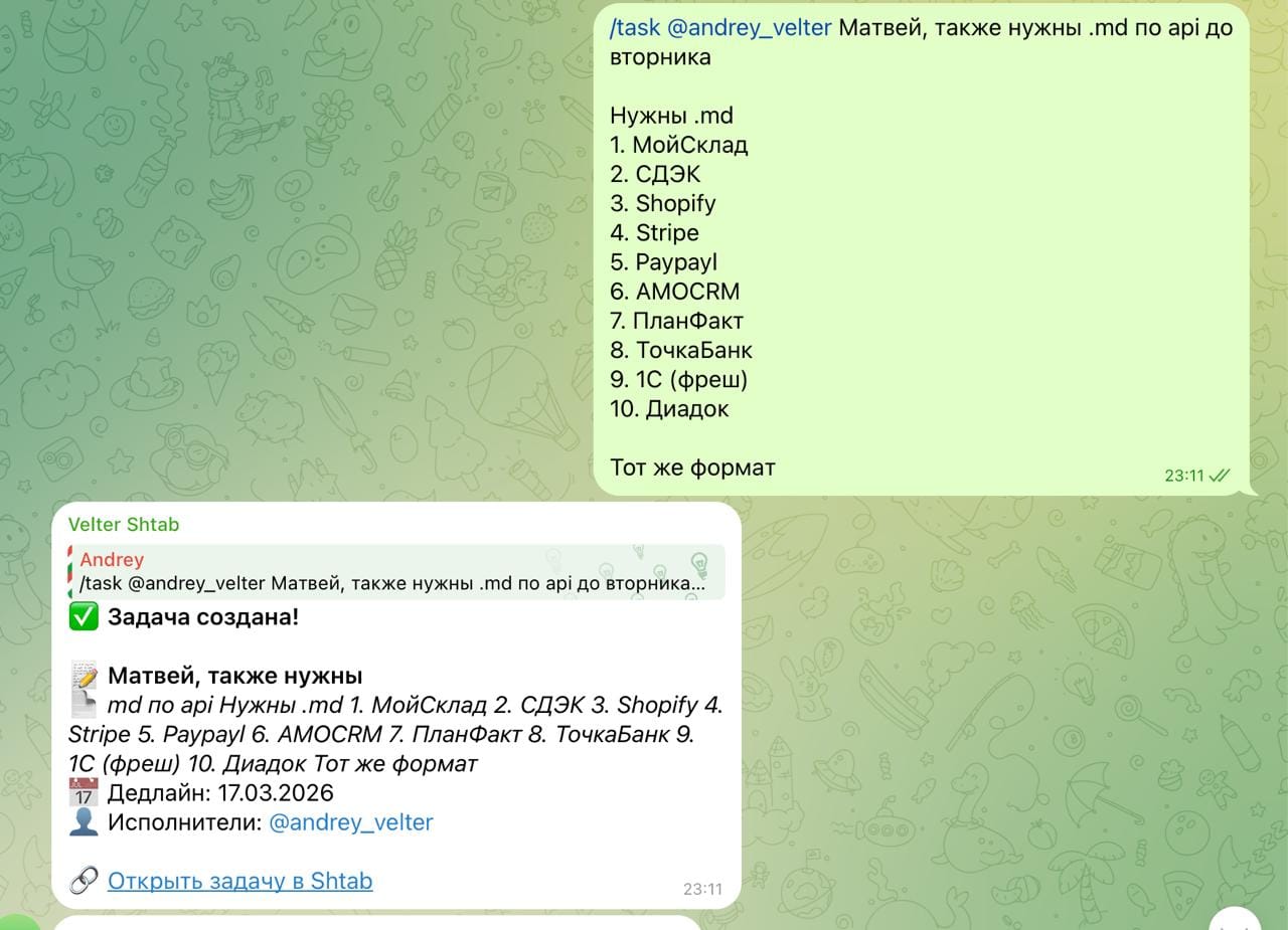 ✅ Ставим задачи в Shtab из «Телеграма». Мы подключили Shtab к Телеграм-боту через API и автоматизировали постановку задач прямо из мессенджера. Задачу создаем одной командой в чате «Телеграма», а бот мгновенно переносит ее в Shtab со статусом «Бэклог». Из сообщения бот распознает исполнителя, описание задачи и дату дедлайна. Например, если написать «до вторника», бот поставит дедлайн по дате ближайшего вторника.