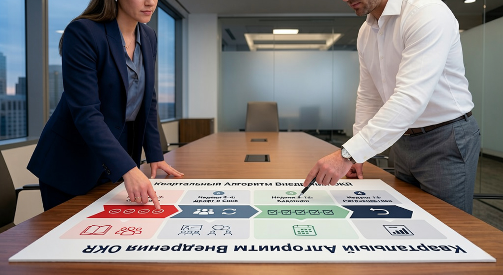 - Неделя 4: OKR-синк. Отделы презентуют свои OKR друг другу. Цель — выявить конфликты и зависимости до старта квартала. Именно здесь HR узнаёт, что продажи планируют рост объёма, и корректирует свои цели по нагрузке.