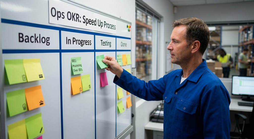 OKR в операциях — это про изменение процесса, а не про увеличение объёма. «Обработать 1000 заявок» — это KPI, норма. «Перестроить процесс так, чтобы заявка обрабатывалась вдвое быстрее» — это OKR, качественное изменение.