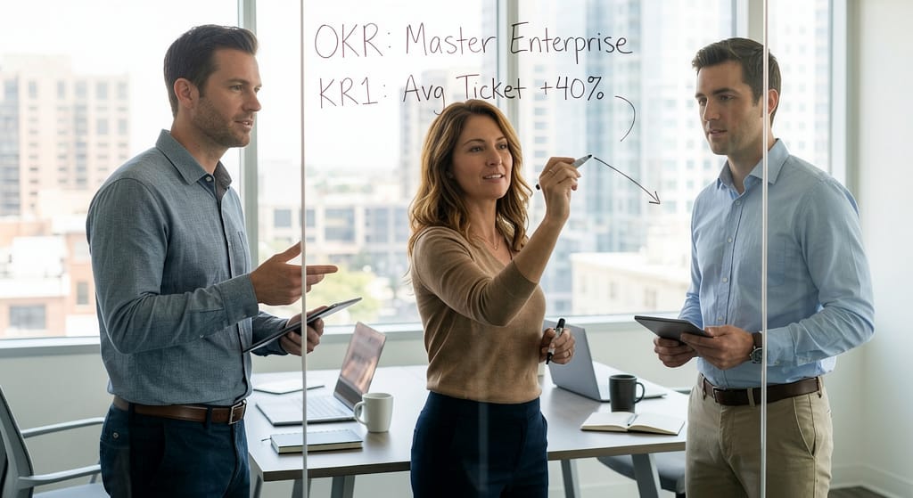 OKR в продажах работают поверх плана, а не вместо него. Они задают амбициозный вектор — выход в enterprise, рост среднего чека, освоение нового сегмента, который обычный KPI не покрывает по определению.