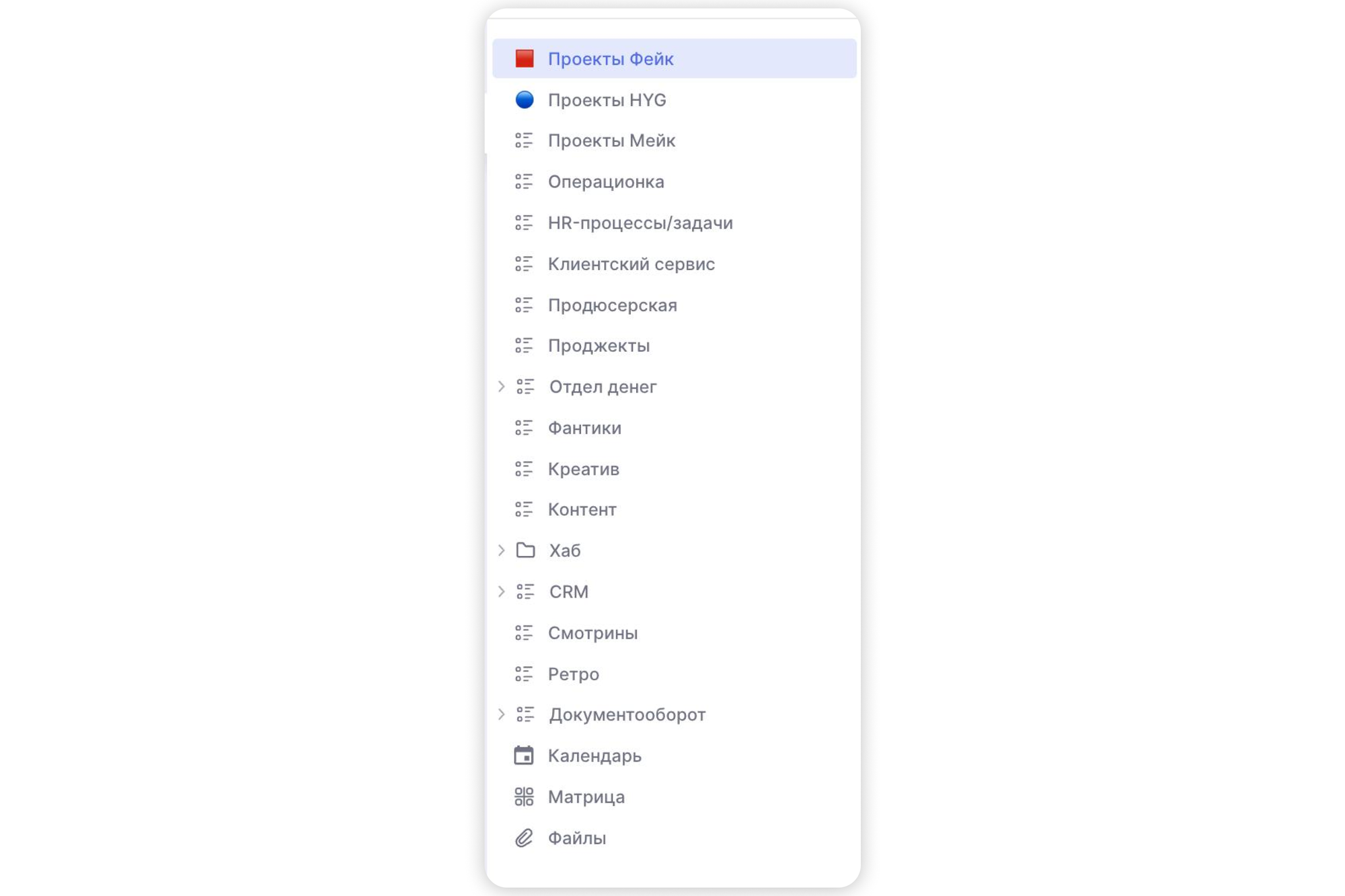 В дополнительных пространствах ведем внутренние отделы и процессы — например, «Операционка», «HR-процессы», «Проджекты», «Отдел денег». Это помогает разграничить внешние клиентские проекты и внутренние задачи.
