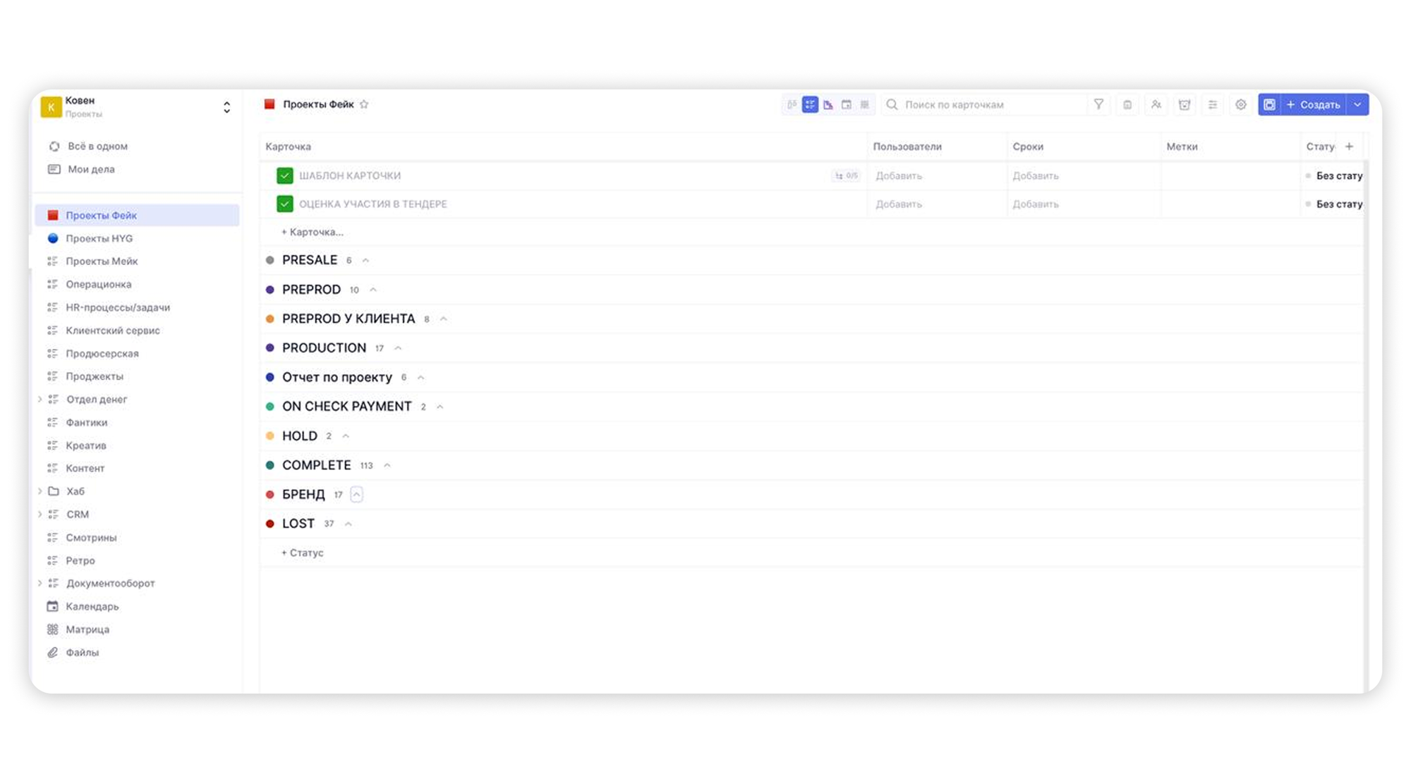 Мы собрали все агентства в одной системе и настроили процессы так, чтобы каждый сотрудник видел, что делать и в какие сроки. Теперь мы управляем проектами прозрачно: ставим задачи, меняем статусы, переносим карточки между агентствами и синхронизируем работу команд. Еще из плюсов: