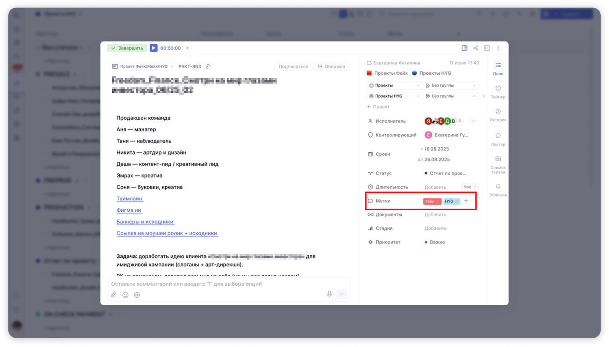 Например, если у дизайнера из HYG перегруз, задача может перейти в Fake — метка и дедлайн при этом сохраняются.