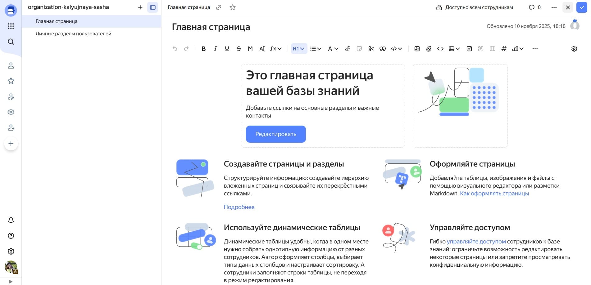 Сервис Яндекс, где можно создавать вики-страницы, наполнять их информацией и совместно редактировать. Чтобы подключить его, нужно сначала создать командный аккаунт в Yandex Cloud Organization.