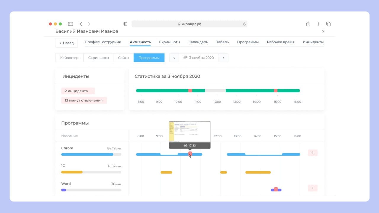 Отечественная программа мониторинга и оценки эффективности работы сотрудников. Обеспечивает полную прозрачность рабочих процессов, фиксируя каждое действие: от времени прихода и ухода до детального анализа экранного времени, снимков экрана и точного учета нажатий клавиш.