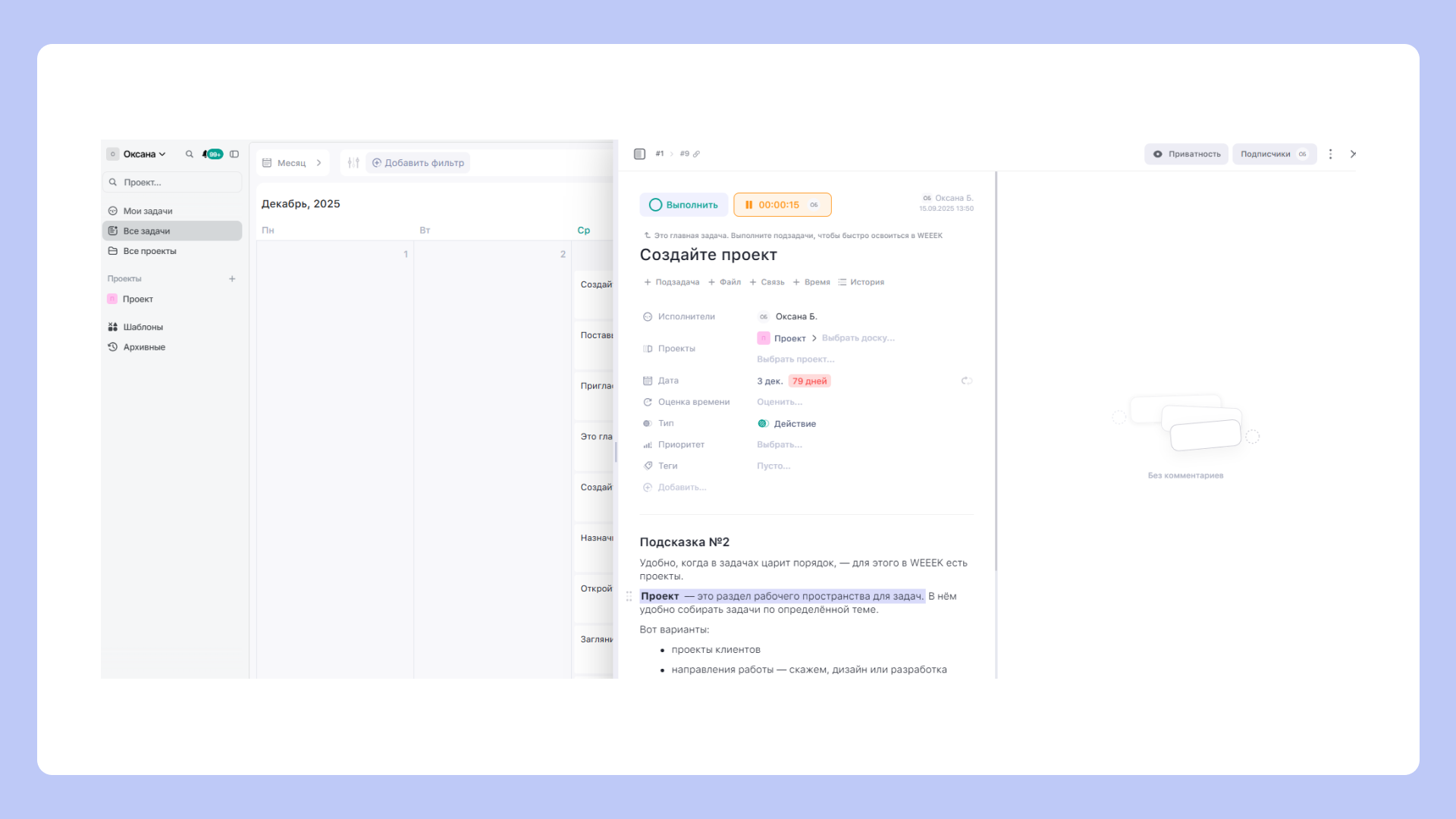 - есть помодоро-таймер, но он не учитывается в подсчете времени, потраченном на задачу.