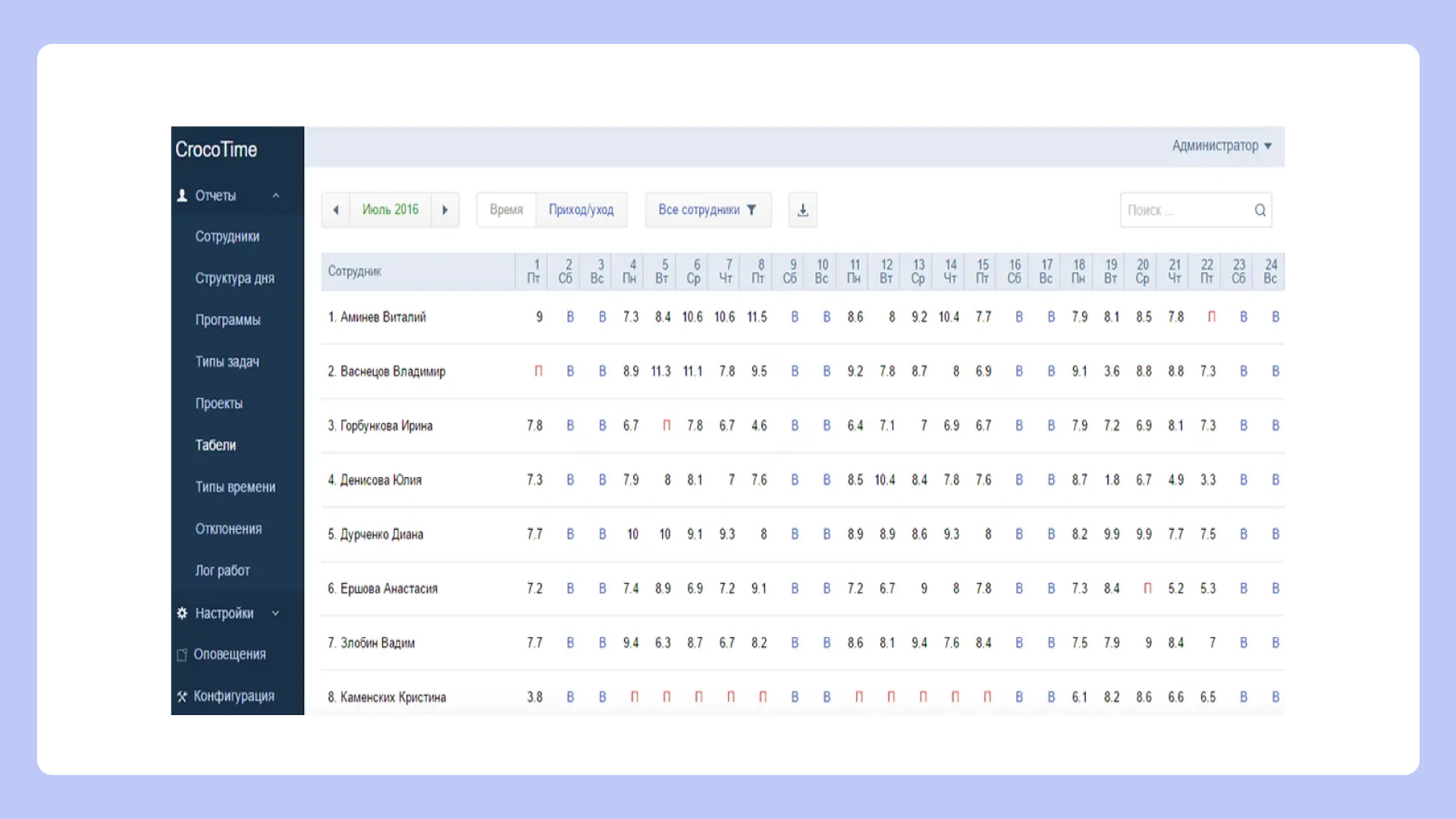 - отчеты по динамике и рейтинги сотрудников.