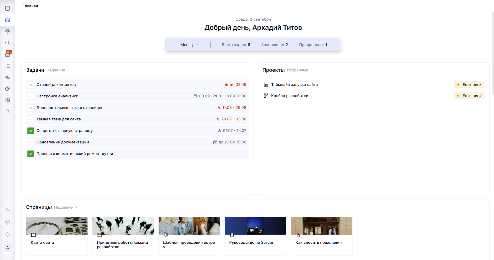 Управляйте задачами, проектами и целями, проверяйте напоминания и комментарии с главной страницы.