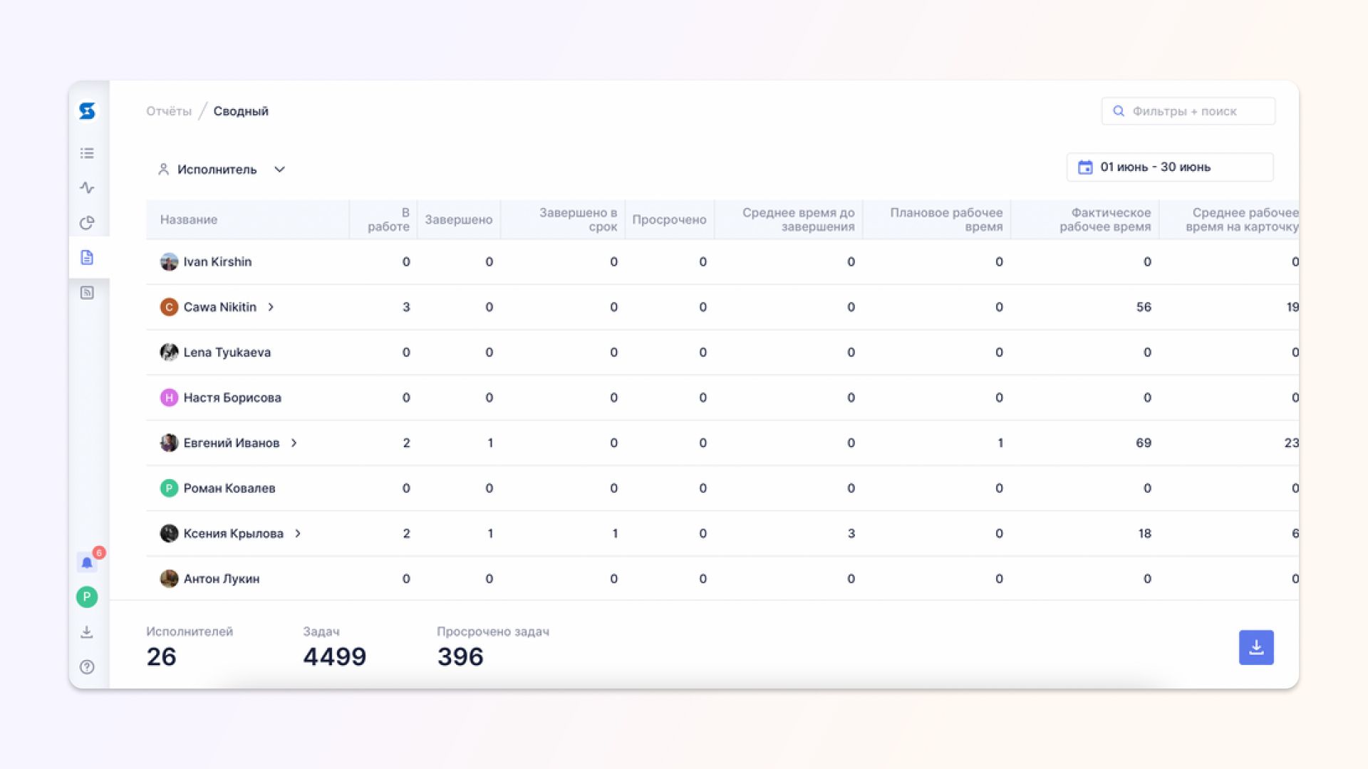 Отслеживайте число исполнителей и задач по каждому проекту, а также получайте детальную статистику по каждому специалисту: